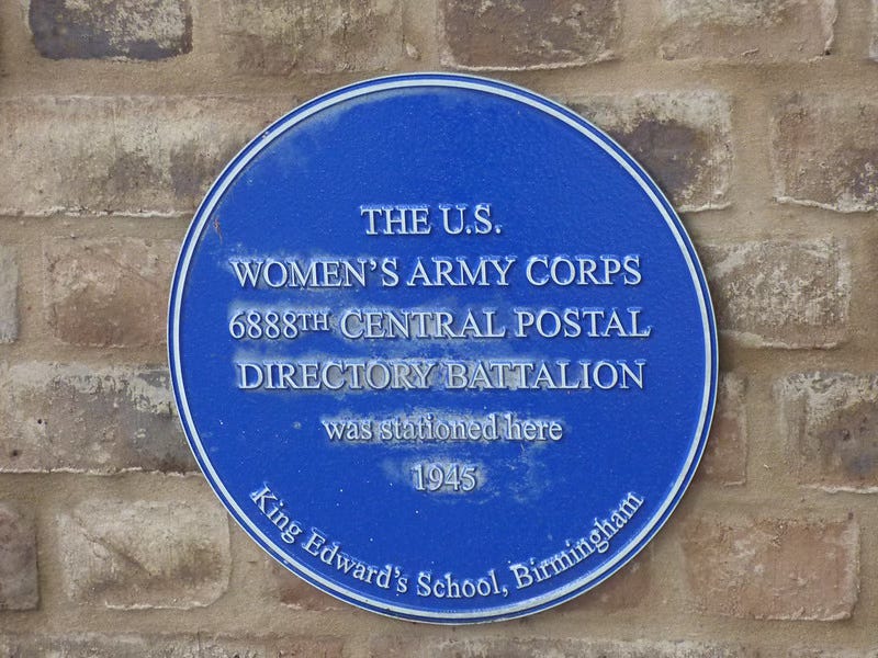The blue plaque at King Edward's School in Birmingham is dedicated to the U.S. Women's Army Corps 6888th Central Postal Directory Battalion, which was stationed there in 1945. Plaque unveiled in 2019. (Photo by Elliott Brown)